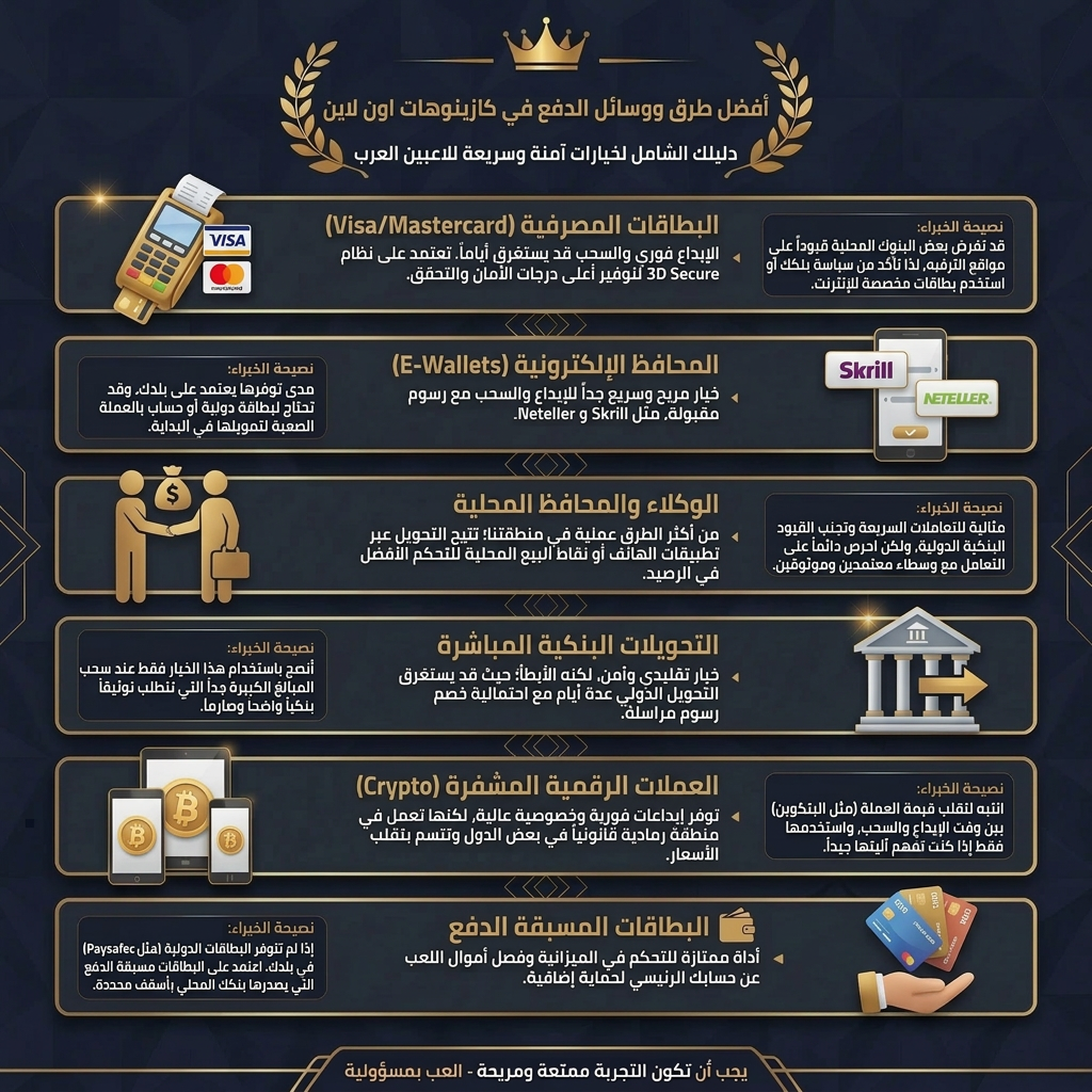 من خلال التجربة، ألاحظ أن كثيرا من اللاعبين في الإمارات يفضلون استخدام المحافظ الإلكترونية مثل Skrill وNeteller، إلى جانب العملات الرقمية مثل Bitcoin وUSDT، بفضل انتشار بيئة التشفير في دبي بفضل هيئة VARA، مع التركيز على العروض التي تقلل الرسوم أو تمنح مزايا إضافية عند الإيداع.